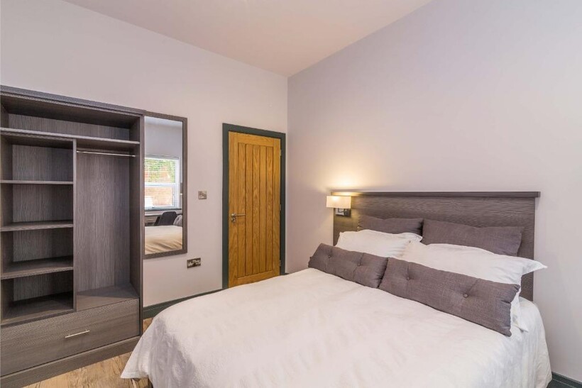 Furnished with a double bed, mattress, wardrobe, bedside table, desk and chair in a modern style the room has everything you require. Both bedrooms also benefit from a wall mounted TV.