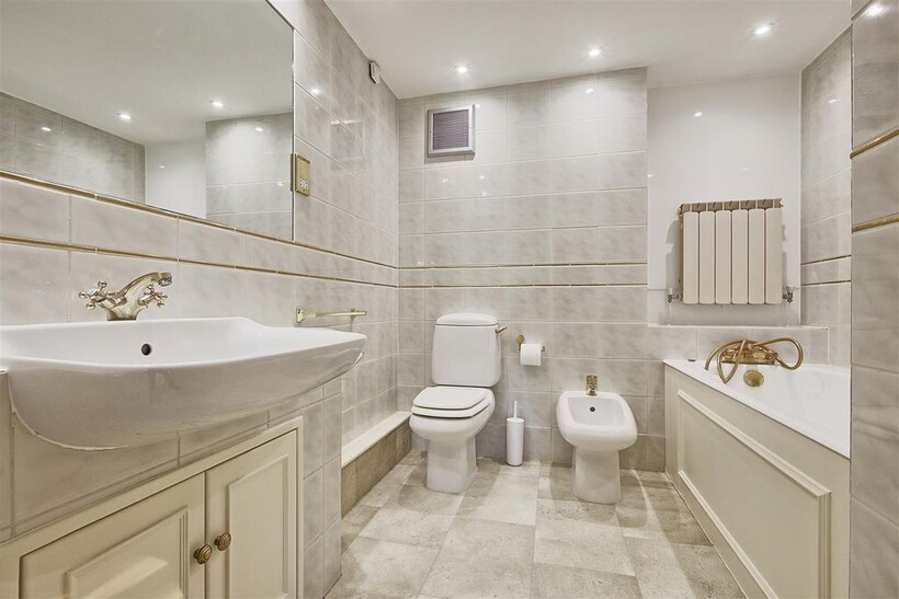 · The Guest bathroom off the first hall has floor-to-ceiling tiles with a gold edging through the centre tile and gold accessories. It has a large walk-in shower, W.C. and hand basin with under-cupboard storage. Elegant lighting and a large fitted mirror.