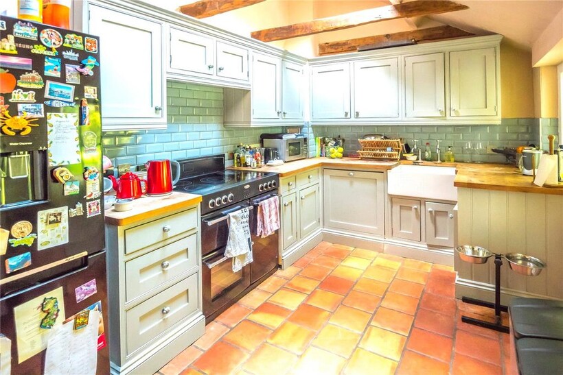 • The kitchen features a good range of painted wooden wall and base units with co-ordinating wooden worktops incorporating a butler sink. There is a 5-ring Belling stove and an integral Baumatic dishwasher, vaulted ceiling with exposed beams and Velux windows above, part-glazed door to the terrace.