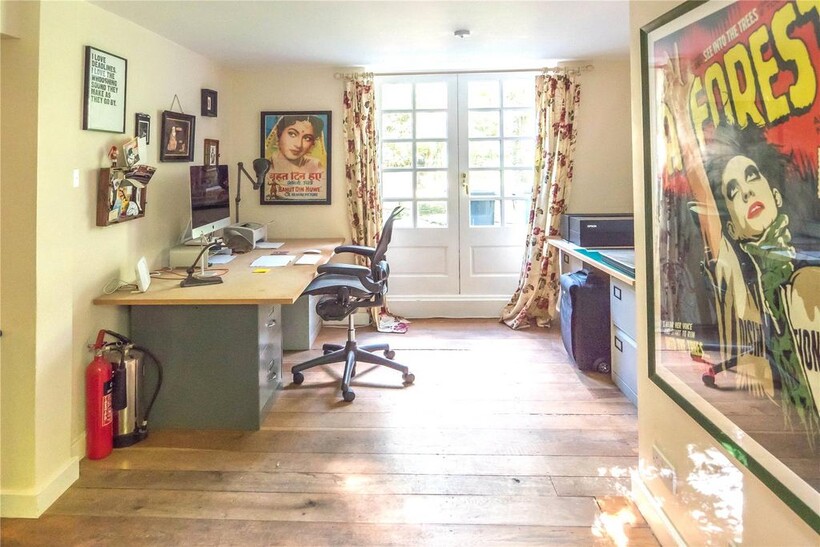 • A part-glazed panelled door leads to the reception hall/study, an excellent and spacious introduction to the house, with wooden flooring and glazed double doors leading out to the terrace and garden. A further door leads to the cloakroom with WC, wash basin, and heated towel rail.