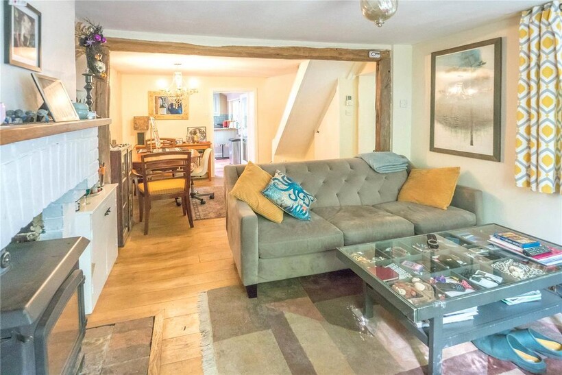 • An opening from the reception hall leads through to the dining room with wooden flooring and via a wooden beamed opening to the sitting room with wooden flooring, two storage cupboards and a painted brick chimney breast with brick hearth and a wood burner.