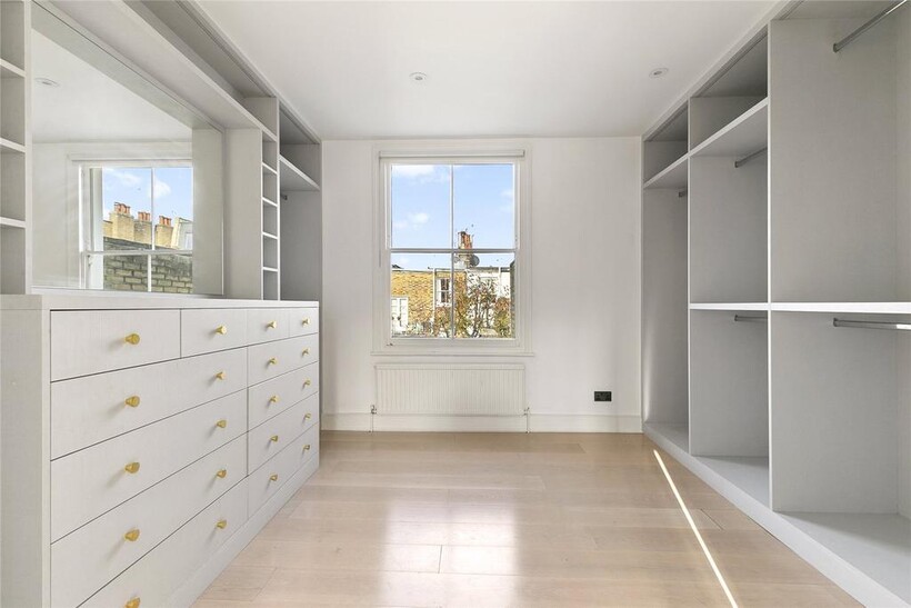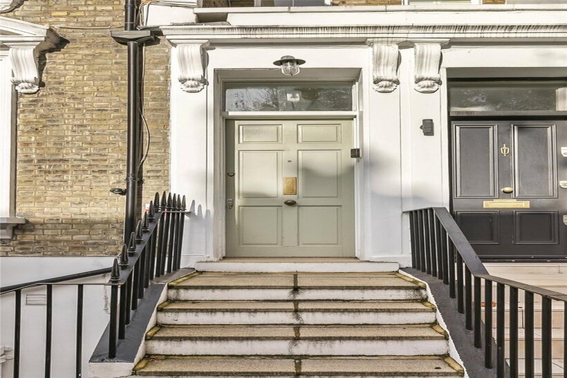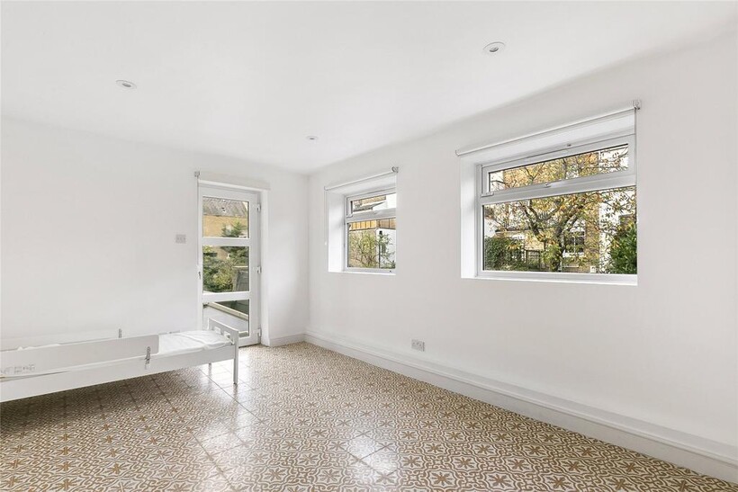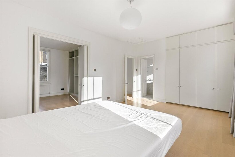 The house is entered on the raised ground floor and there is an additional separate entrance at the natural lower ground floor level. The spacious entrance hall leads to a wonderful L-shaped reception which spans the width of the front elevation and has French doors overlooking the rear garden. Tall sash windows, built-in shelving, a modern fireplace and dark stained floors complement the room's elegant proportions.