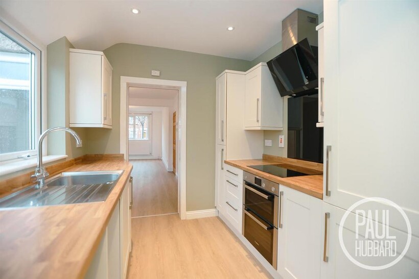Kitchen - 2.6m x 2.6m - UPVC double glazed window to side and door opening into the rear garden, newly fitted LVT flooring, a radiator, wall mounted gas boiler, fitted units above and below laminate work surfaces, space for a washing machine, stainless steel sink and drainer, integral oven, grill, fridge.freezer, induction hob and extractor fan.