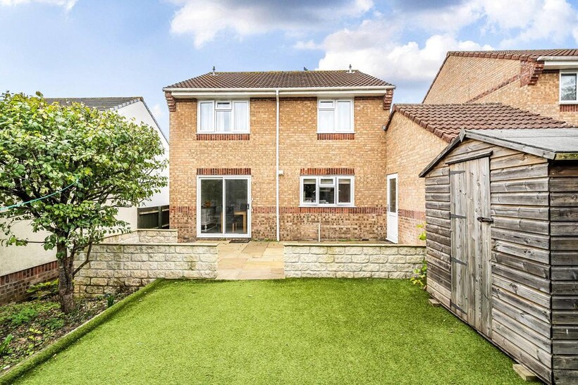 At the rear, the garden is enclosed, featuring a patio terrace leading to an artificial lawn with flower beds, and a timber garden shed. There is a courtesy door to the garage.