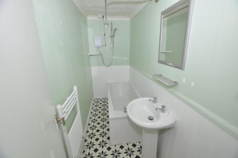 Bathroom - 2.96m x 1.11m (9'8" x 3'7") - Bathroom comprises a pedestal wash-hand basin with mixer tap fittings, a panelled bath with an electric shower over, and a heated towel radiator.