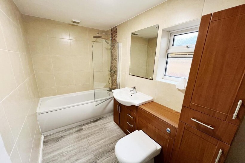 Bathroom - 2.87m x 1.60m (9'5 x 5'3) - White panelled bath with shower over, wash hand basin, W/C, uPVC window, extractor fan, spotlights, hand towel radiator, tiled splashbacks.