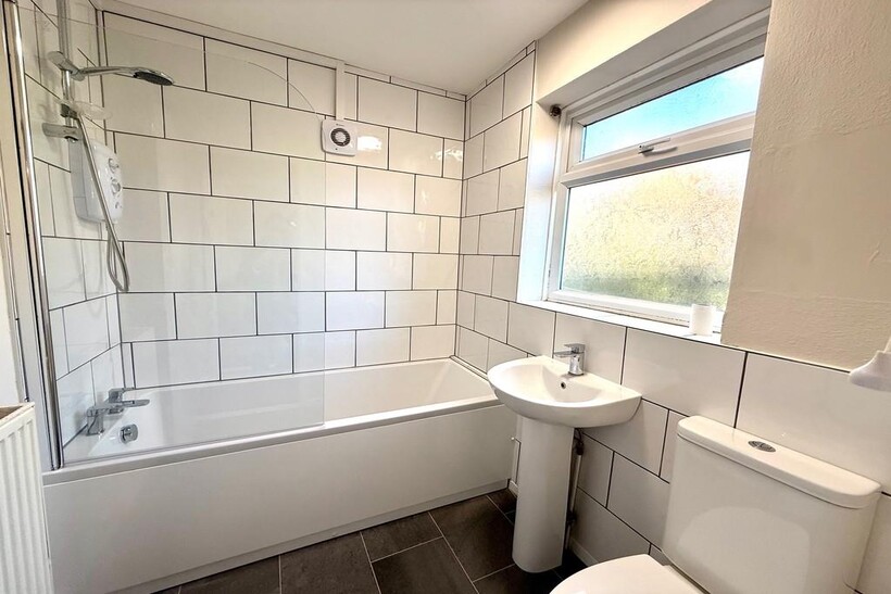 BATHROOM newly fitted white suite, bath, electric shower over, low level w/c, sink and pedestal, wall radiator, double glazed window
