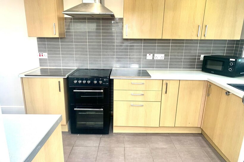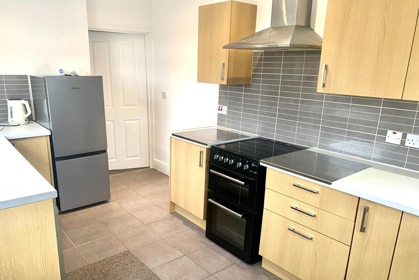 KITCHEN - Various wall and base units. Windows to rear and side and door to back parking area. Kitchen appliances consist of washing machine, slim line dishwasher, fridge/freezer and electric oven.