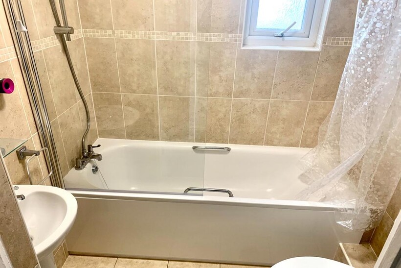 BATHROOM - White suite with bath with shower over, sink and toilet. Window to side.