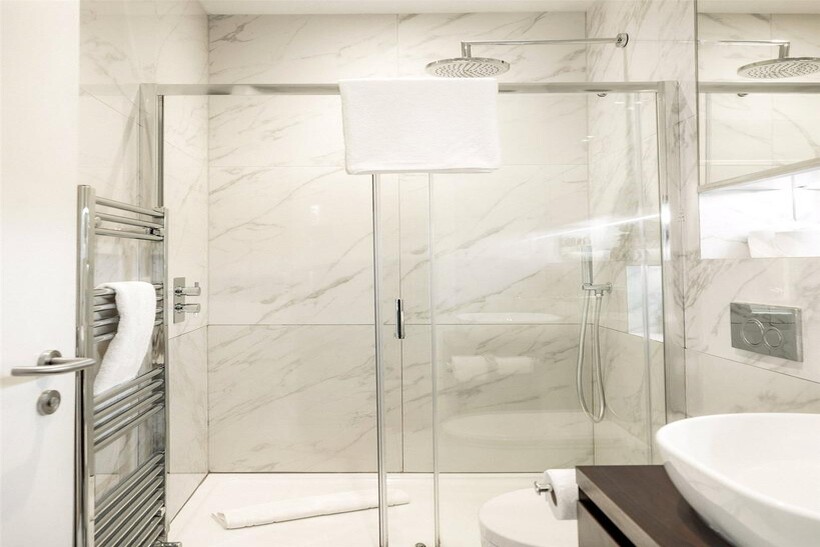 The second floor comprises the luxurious principal bedroom with ensuite bathroom finished in elegant marble, alongside an additional beautifully proportioned bedroom, also with ensuite bathroom featuring contemporary fittings. Built-in storage maximises the refined interiors throughout this level.