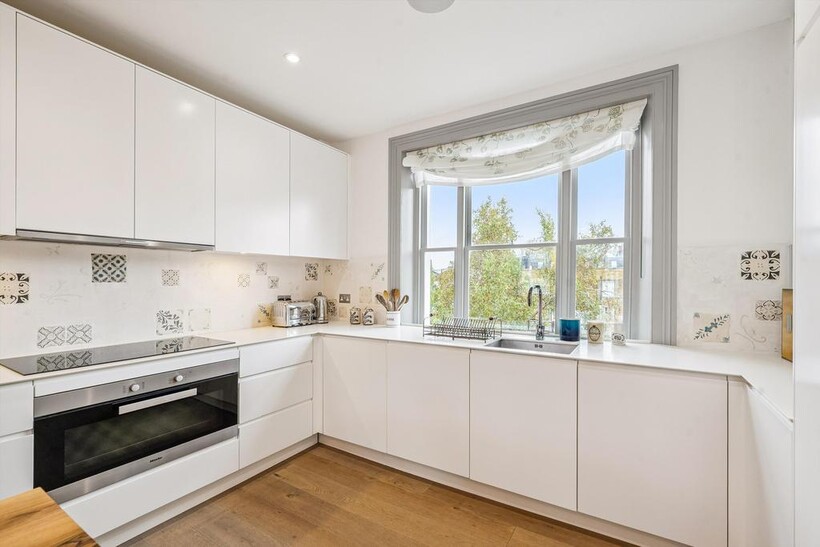 This impressive apartment occupies the upper levels of a handsome period building on highly sought-after Blenheim Crescent. Designed with both style and comfort in mind, the property features a generous open-plan kitchen and reception room, complete with a gas fireplace and integrated Sonos ceiling speakers—perfect for hosting or relaxing.