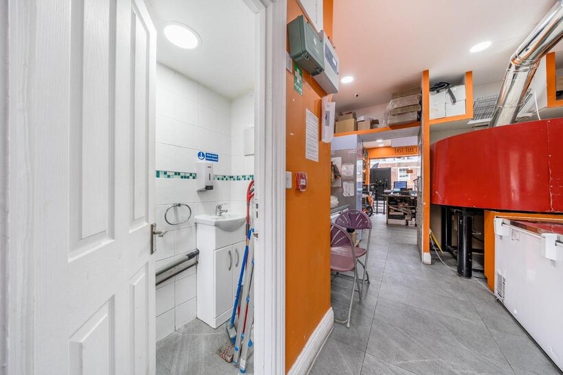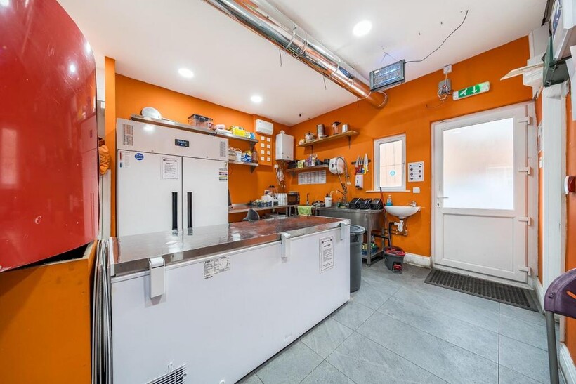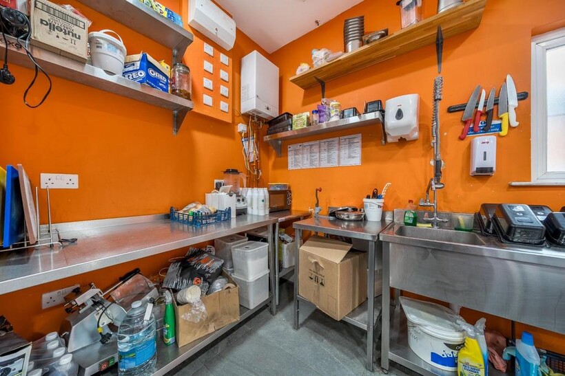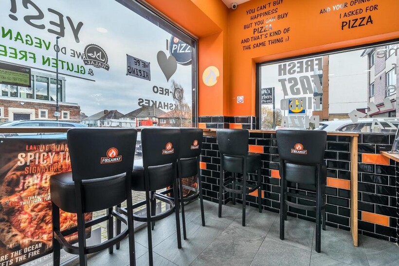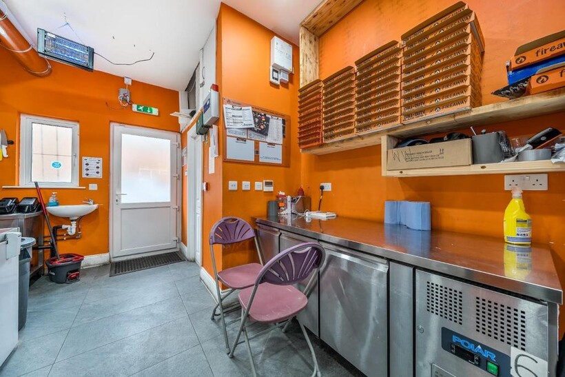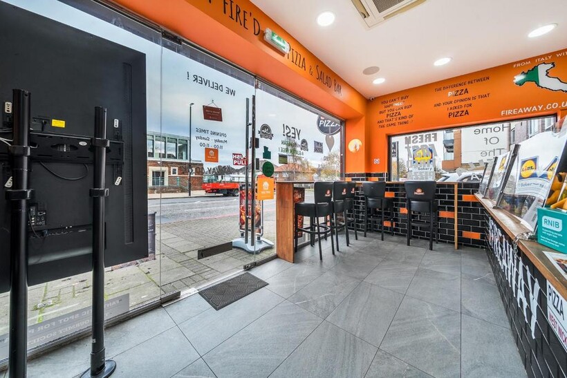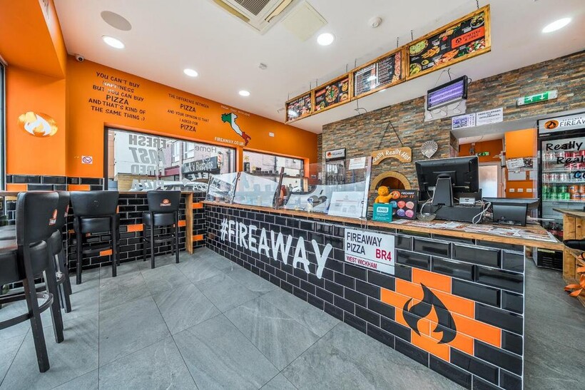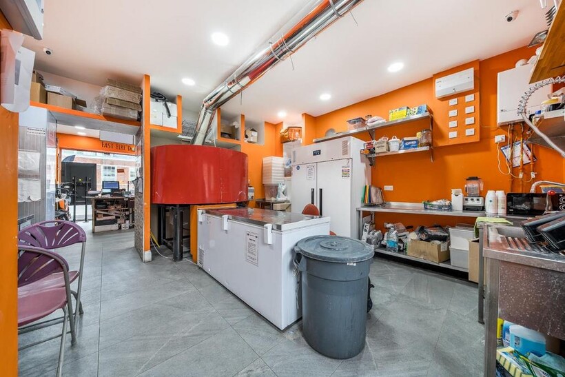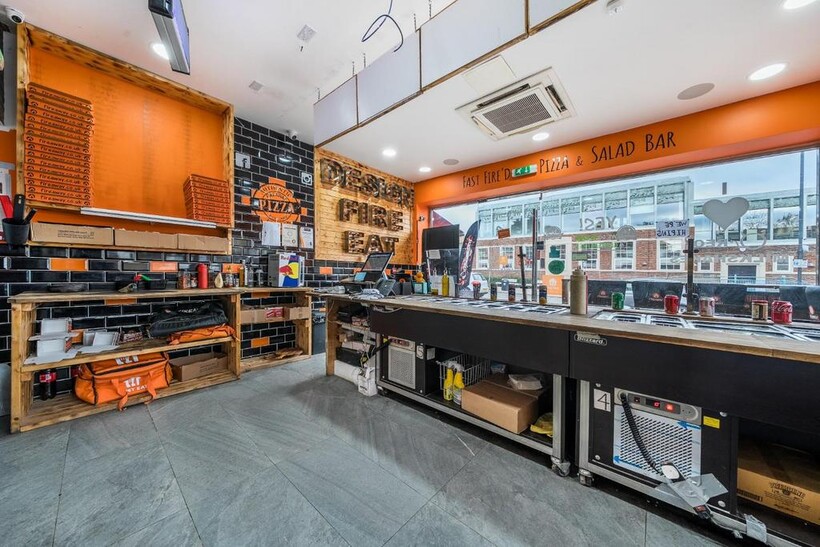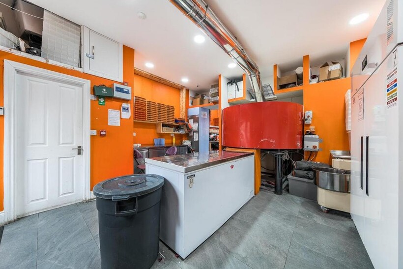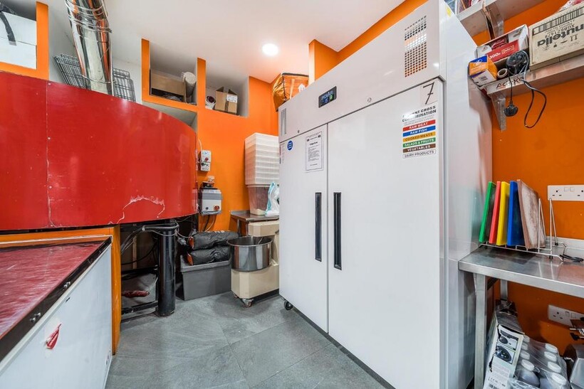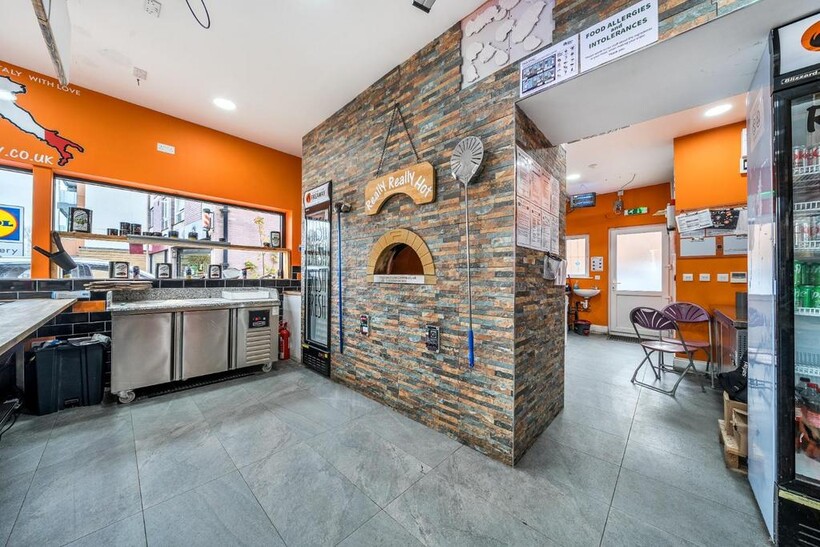 Shop And Kitchen - 18'5 x 16'6 - This commercial space presents a vibrant and modern pizza shop with a bold orange and black colour scheme, creating a lively and welcoming atmosphere. The front area offers a bright seating section with high stools positioned along large windows, perfect for customers to enjoy their food while watching the street outside. The shop area features a long counter with branded black tiles and bold fire-themed graphics, alongside prominent signage and menu boards that add character to the space. Towards the rear, the kitchen is spacious and well-equipped, boasting a distinctive pizza oven set into a stylish brickwork surround, underscoring the focus on freshly made pizza. High ceilings with recessed lighting brighten the whole area, while stainless steel work surfaces and ample storage ensure functionality and efficiency. There is also a separate utilitarian area for food preparation and storage, with robust stainless steel shelving, sinks, and refrigeration units, all maintaining a clean and practical workspace. The shop has an overall sleek yet industrial feel, designed to accommodate both customer service and food production seamlessly.
