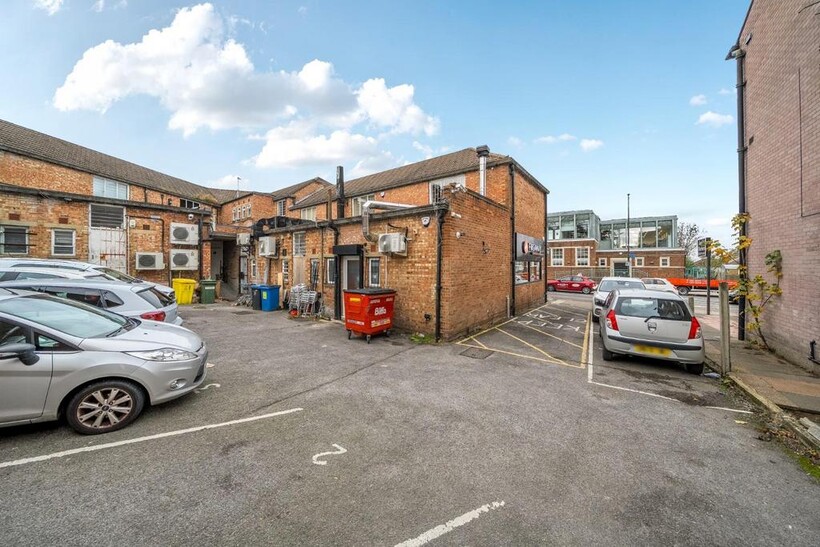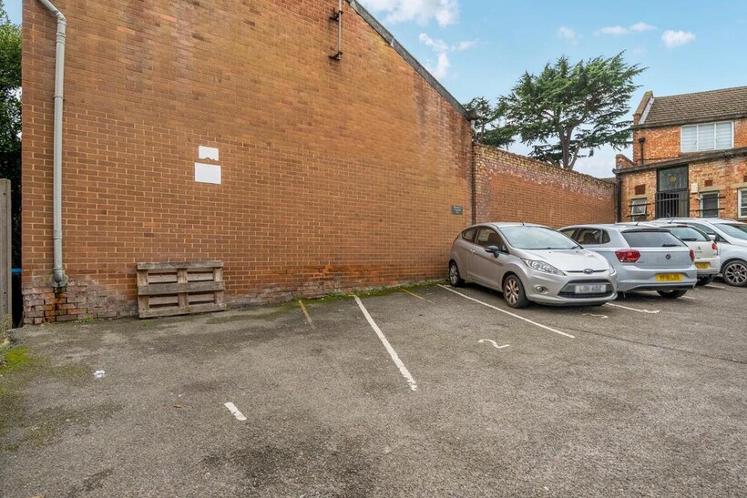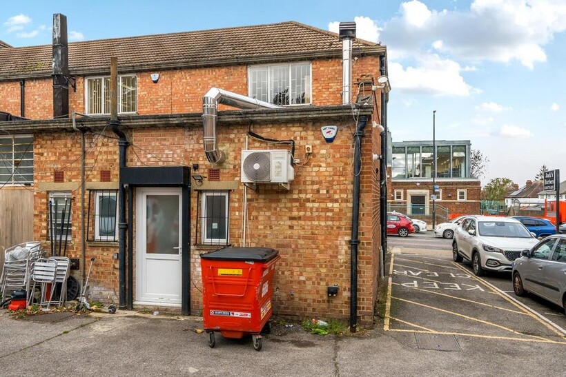 Carport - 14'2 x 14'2 - The exterior of the property includes a practical carport parking space measuring 14'2 by 14'2, providing a convenient area for vehicle parking or deliveries. The surrounding exterior area features a tidy service yard with marked parking bays and simple brickwork, reflecting the functional nature of this commercial premises.