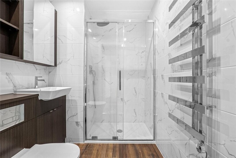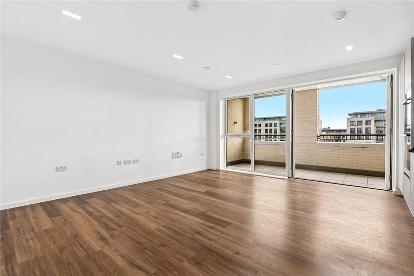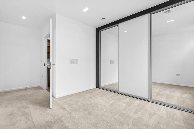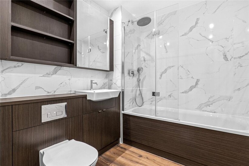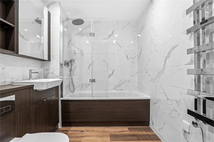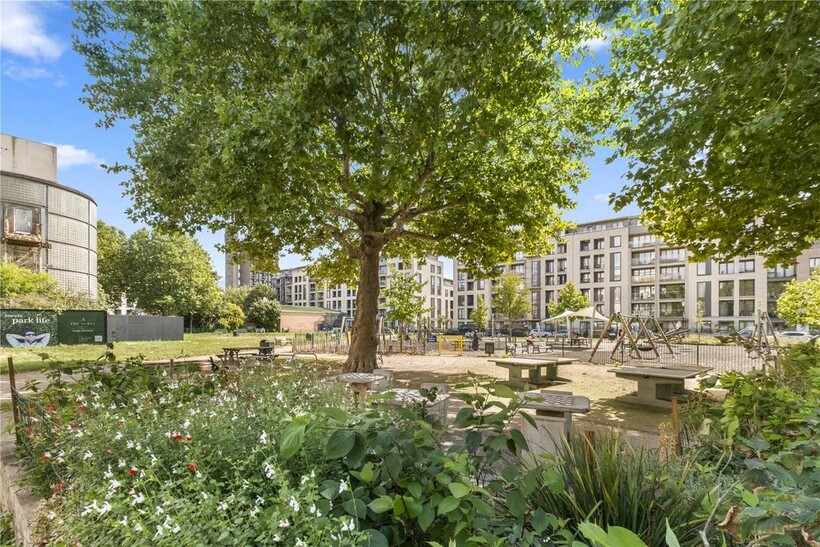 The spacious, open-plan kitchen and reception room offers excellent natural light with southerly views over Athlone Gardens, an open green space positioned at the heart of the development. The flat has two double bedrooms, each with fitted wardrobes, two bathrooms, including an en-suite shower room off the principal bedroom.