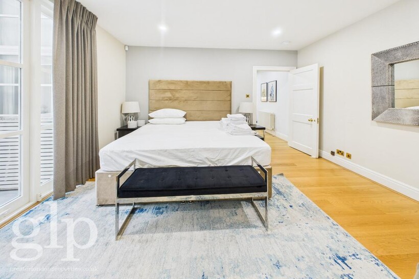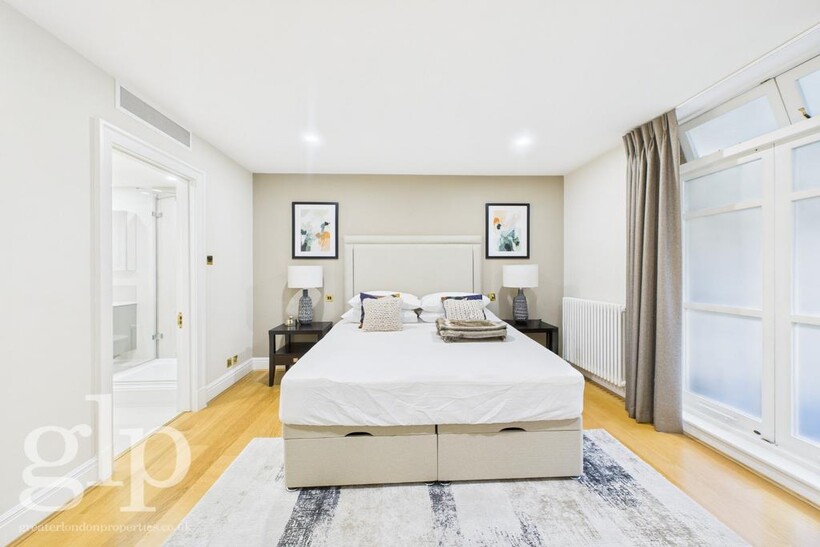 Designed for comfort and convenience, the apartment features air conditioning throughout, generously proportioned bedrooms, and two beautifully finished contemporary bathrooms with high-quality fittings. The private courtyard patio provides a rare and tranquil outdoor retreat in central London, ideal for al fresco dining, morning coffee, or simply unwinding in peace.