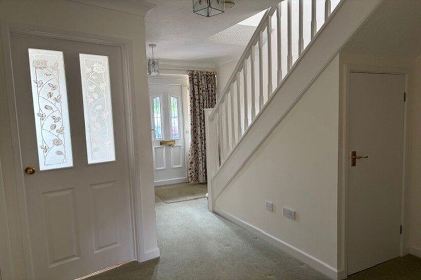Radiator, stairs to first floor, under stair storage cupboard, door to integral garage.