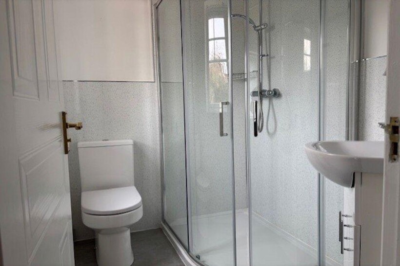 White suite comprising wash hand basin with cupboard under, shower enclosure with fitted shower, and close coupled WC, double glazed window to front, heated towel rail.