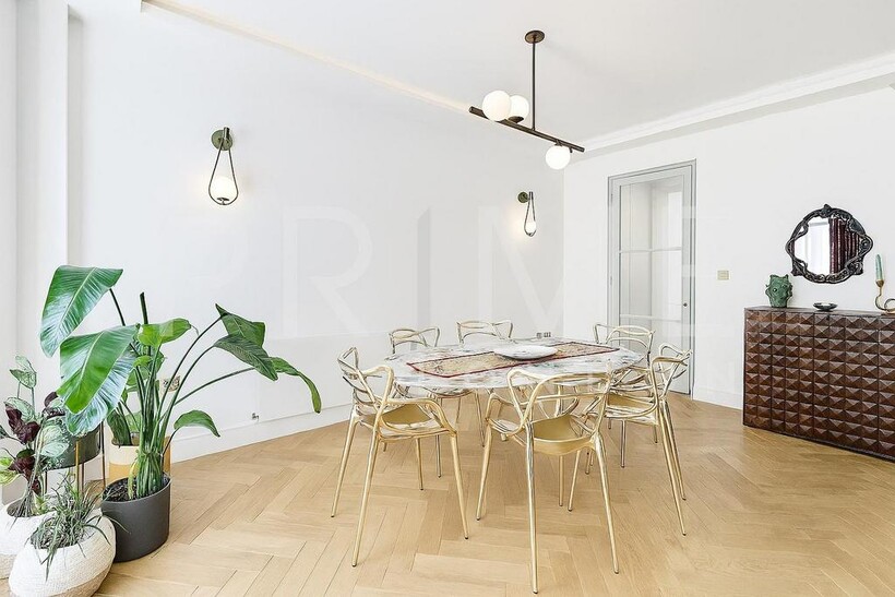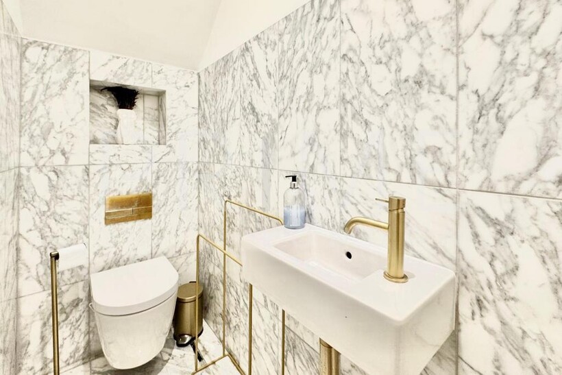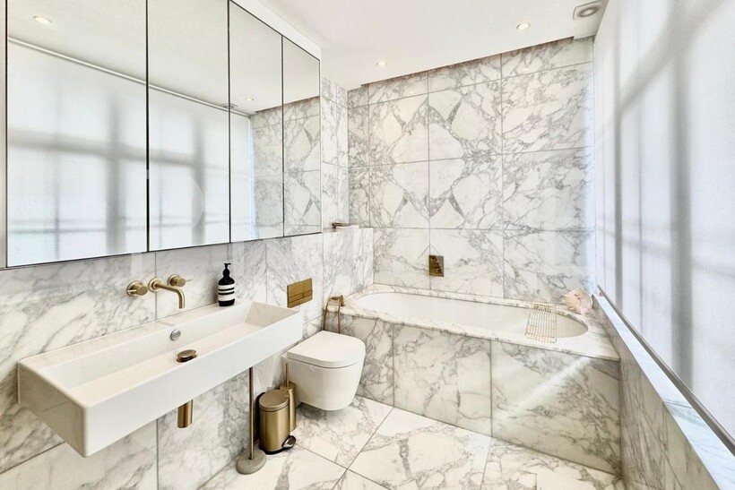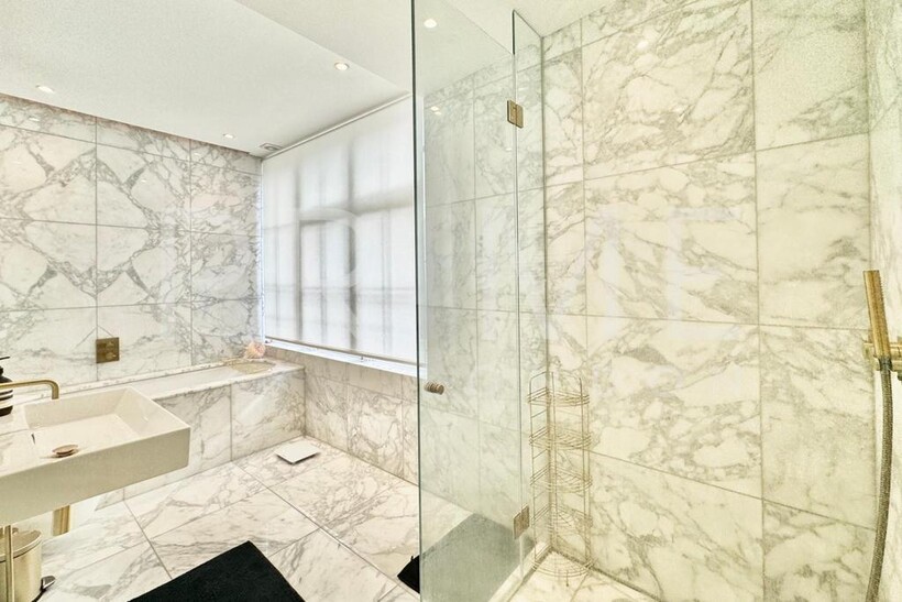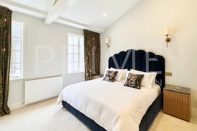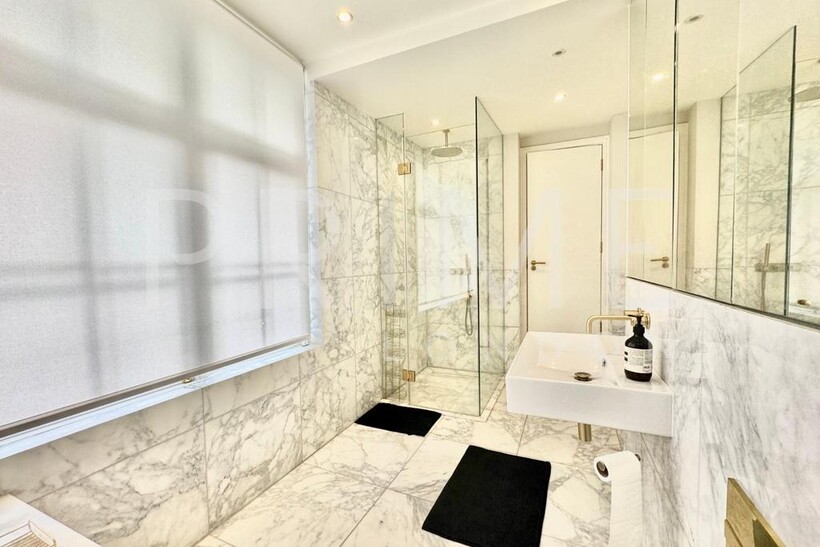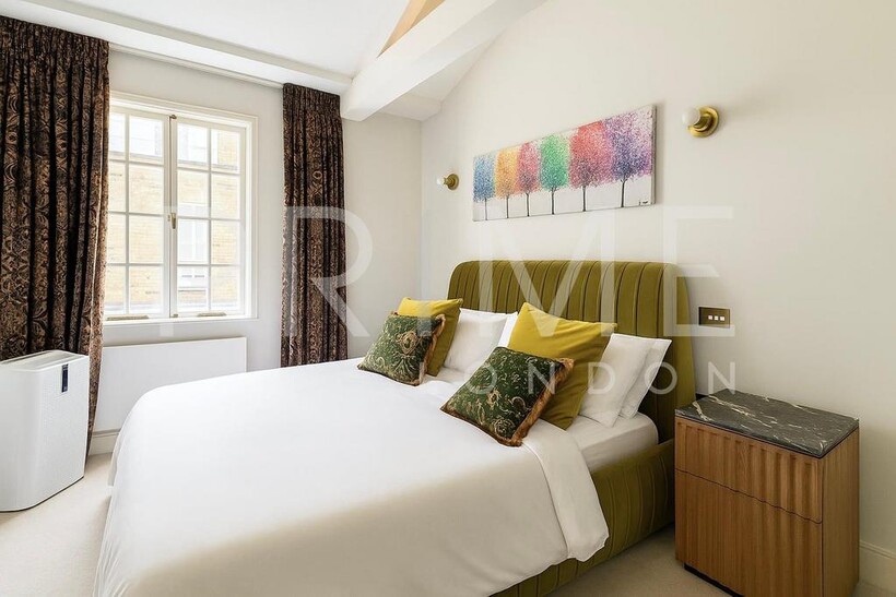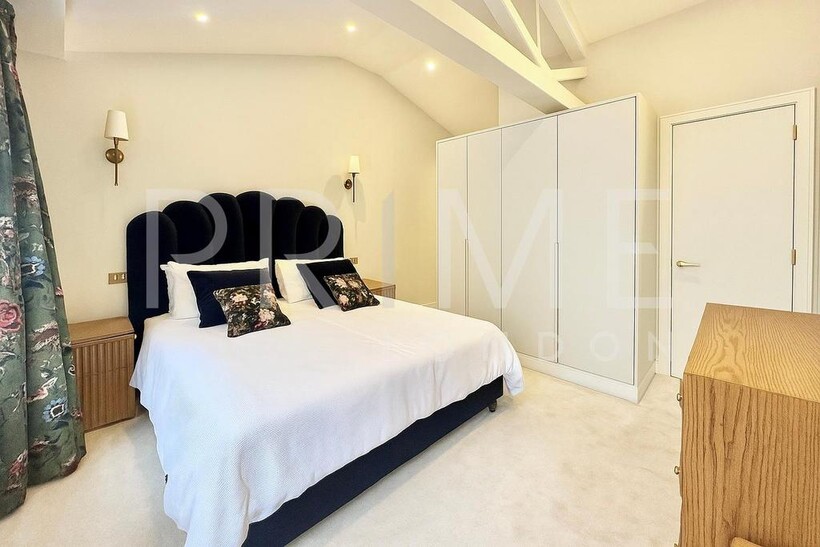 This stylishly presented mews house, located in one of Belgravia’s most sought-after mews, is available for lease through Prime London. The home is filled with natural light and offers well-proportioned living space, totalling 1,188 sq ft (110 sqm). The reception room features high vaulted ceilings, solid wood flooring, and original shutters, creating a sense of both elegance and comfort. The kitchen is well-equipped with integrated appliances and space for casual dining. A cloakroom is neatly tucked away on the half-landing.